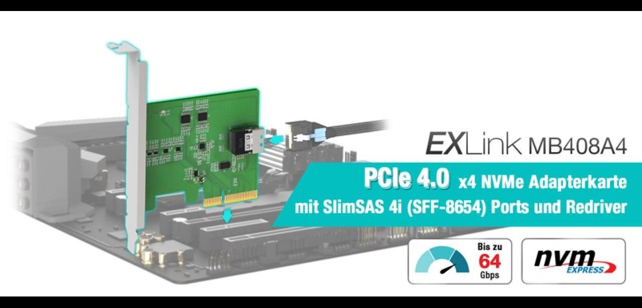 Mit der EXLink MB408A4 Adapterkarte lassen sich Hochgeschwindigkeitsverbindungen zwischen Host und NVMe-Laufwerken realisieren. Die PCIe Gen4 x4 Schnittstelle stellt bis zu 64 Gbps bereit, während der SlimSAS 4i (SFF-8654) Anschluss sichere Leitungswege über Standard-Leiterbahnbeschränkungen hinaus ermöglicht. Dieses System gewährleistet eine robuste Signalintegrität, reduziert Datenverlust-Risiken bei langen Verbindungen und unterstützt anspruchsvolle Workloads in Enterprise- und Industriebereichen. Flexible Einsatzszenarien vereinfachen Integration und optimieren Workflows. Karte eignet sich ideal für Serverlandschaften und Storage-Architekturen.
