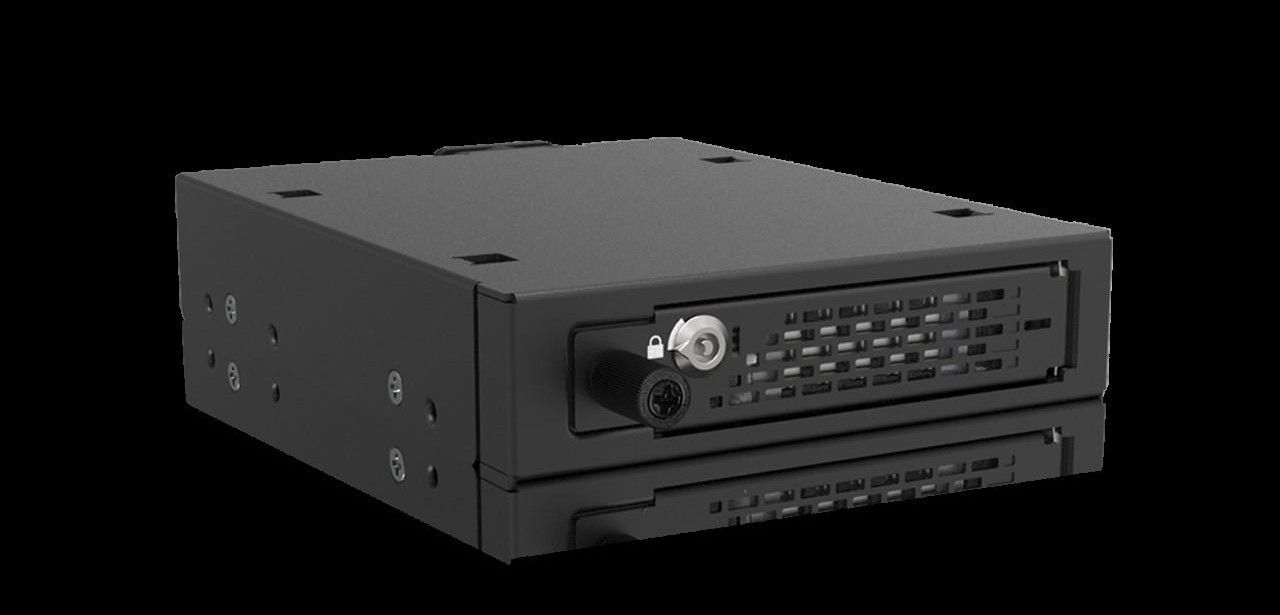 Für maximale Sicherheit in sensiblen Anwendungen kommt der Wechselrahmen mit zwei unabhängigen Verriegelungsstufen. Ein Zylinderschloss sichert den Tray gegen unberechtigtes Entfernen und bietet physischen Schutz vor Manipulation. Gleichzeitig zieht eine präzisionsgefertigte Rändelschraube das Laufwerk fest an das Gehäuse, um Vibrationen und Erschütterungen wirkungsvoll aufzunehmen. Diese doppelte Absicherung beugt Datenunterbrechungen zuverlässig vor und sorgt in autonomen Fahrzeugen, Industrierobotern sowie militärischen Anlagen für dauerhafte Betriebskontinuität sicherheitskritische Prozesse ohne Ausfallzeiten garantierend, rundum abgesichert.
